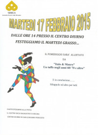 Festa del martedì grasso con gli ospiti del Centro diurno di San Giovanni in Persiceto e Centro socio ricreativo di San Matteo della Decima. Coriandoli, stelle filanti, giochi, musiche di "Italo e Mauro" un tuffo negli anni 60/70, travestimenti e ricco buffet di carnevale faranno divertire tutti i presenti.